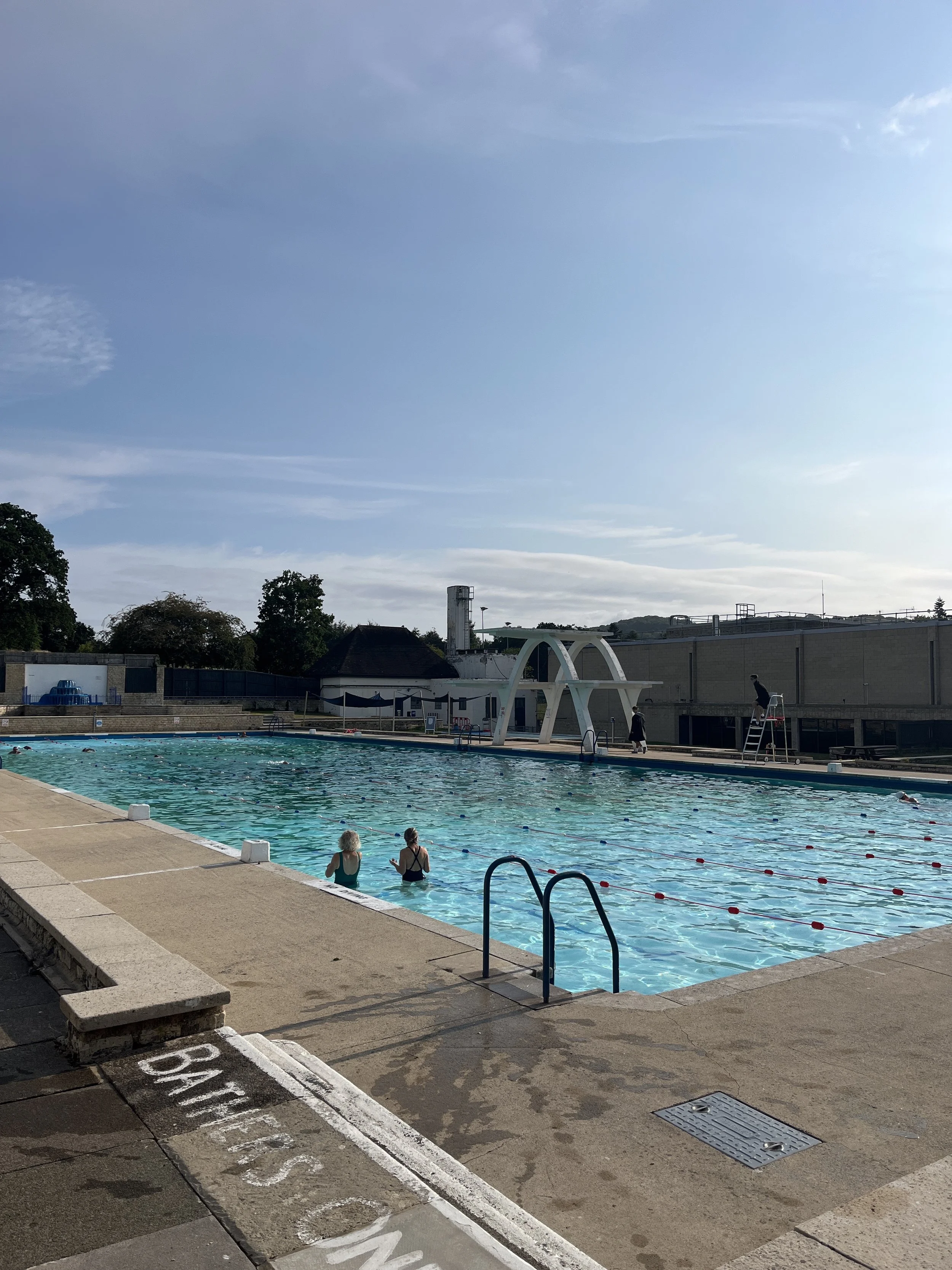 Swam here again this morning, that’s 3 swims in a row. I brought my yoga mat with me too but not got on it yet. I’m a social yoga person but a less social swimmer, not like the women in the photo. I often don’t chat to anyone at Tooting Bec where I usually swim (I have a few acquaintances I’ve got to know there) but sometimes I do. I go alone and see what happens. It’s the water that draws me. Swimmers smile often, I’ve found. There’s a shared love of the experience. Most people think I’m really chatty and I can be but growing up an only child forces one to spend a lot of time quietly doing things or talking to inanimate objects or oneself. It’s been really nice travelling to swimming with Alice my host, we’ve had a laugh too which is a sure sign of a kind relaxed human being.
